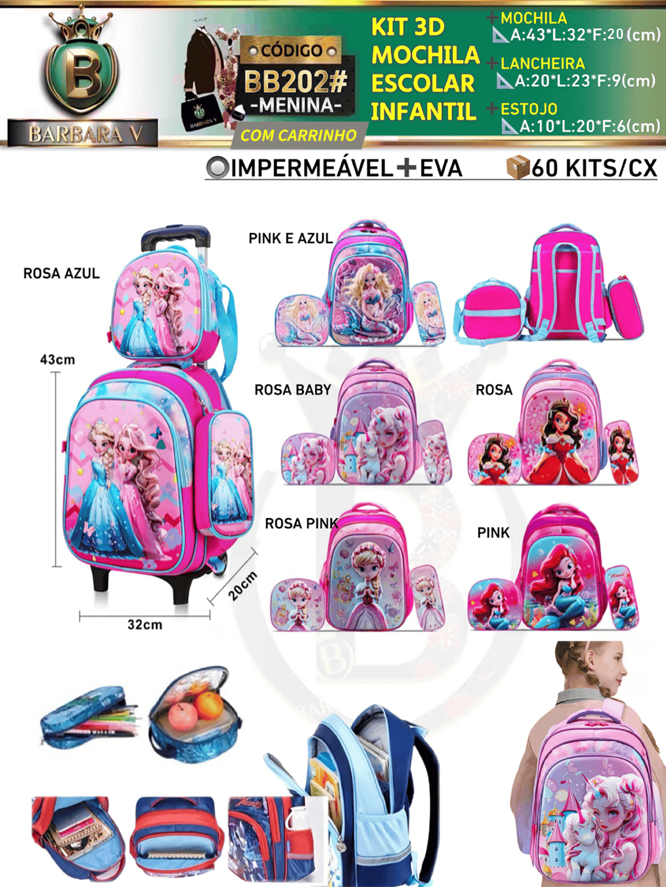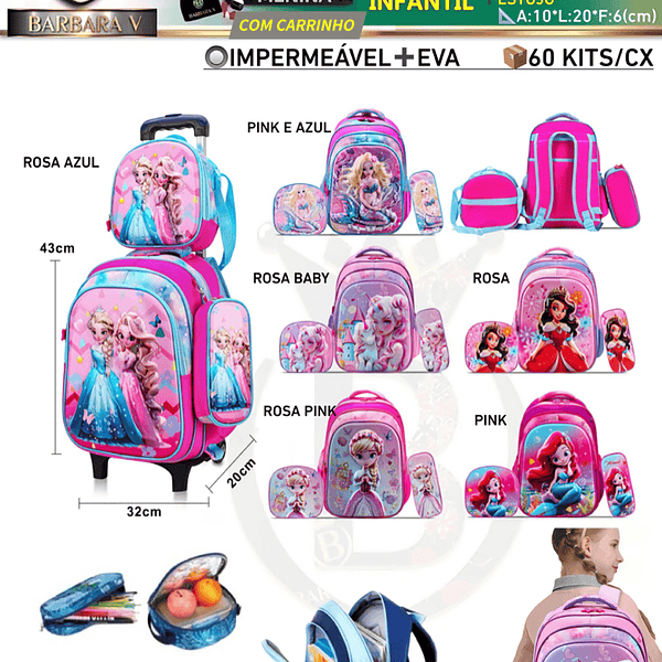KIT 4 peças 3D MOCHILA+ESTOJO+LANCHEIRA+CARRINHO ESCOLAR INFANTIL pacote com 15 KITS cor sortido cada KIT R$115