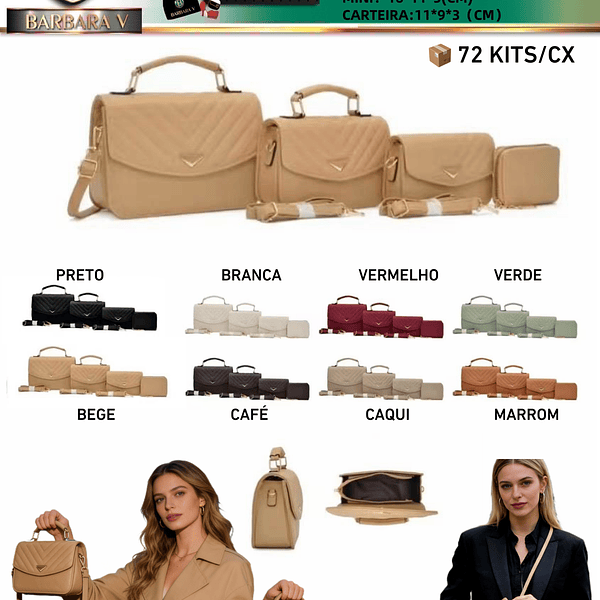 Kit 4 Peças bolsinha 3 peças+carteira pacote com 15 kits cor sortido cada kit R$60